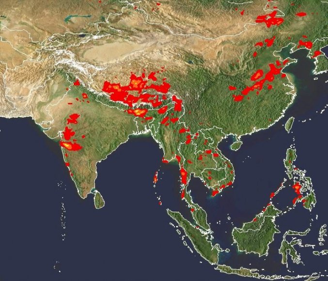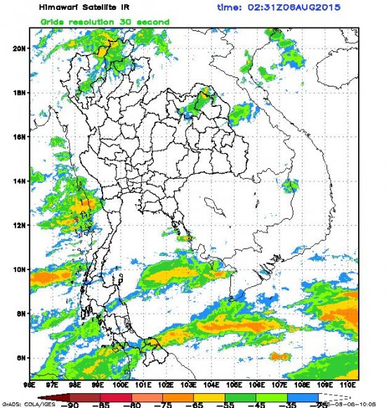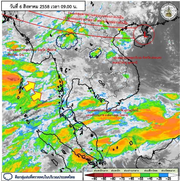 ลักษณะอากาศทั่วไป ร่องมรสุมพาดผ่านภาคเหนือตอนบน เข้าสู่หย่อมความกดอากาศต่ำบริเวณอ่าวตังเกี๋ย ประกอบกับมรสุมตะวันตกเฉียงใต้กำลังแรงพัดปกคลุมทะเลอันดามัน ประเทศไทย และอ่าวไทย ลักษณะเช่นนี้ทำให้บริเวณประเทศไทยมีฝนตกหนาแน่น และมีฝนตกหนักบางแห่งในบริเวณภาคตะวันออกเฉียงเหนือ ภาคตะวันออก และภาคใต้ฝั่งตะวันตก ขอให้ประชาชนในพื้นที่เสี่ยงภัยโดยเฉพาะบริเวณจังหวัดหนองคาย บึงกาฬ สกลนคร นครพนม จันทบุรี ตราด ระนอง พังงา และภูเก็ต ระวังอันตรายจากฝนตกหนักและฝนที่ตกส.